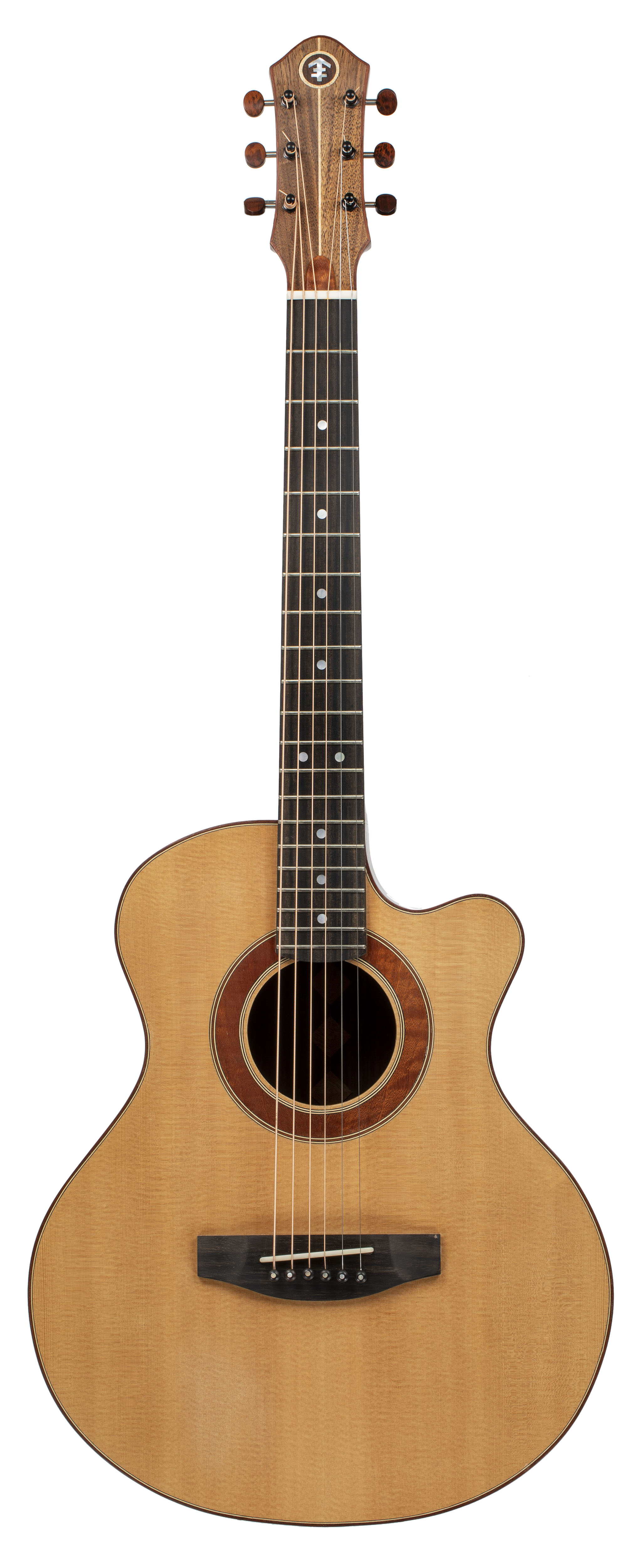 This guitar is a joy to hold and play. With a short scale length (597mm) and small body, this guitar sounds bigger than it is. The top is Sitka spruce, with a carefully tuned bracing pattern. The back and sides are Indian Rosewood with inlays of quilted sapele. The rosette is also quilted sapele. The neck is walnut laminated with maple.